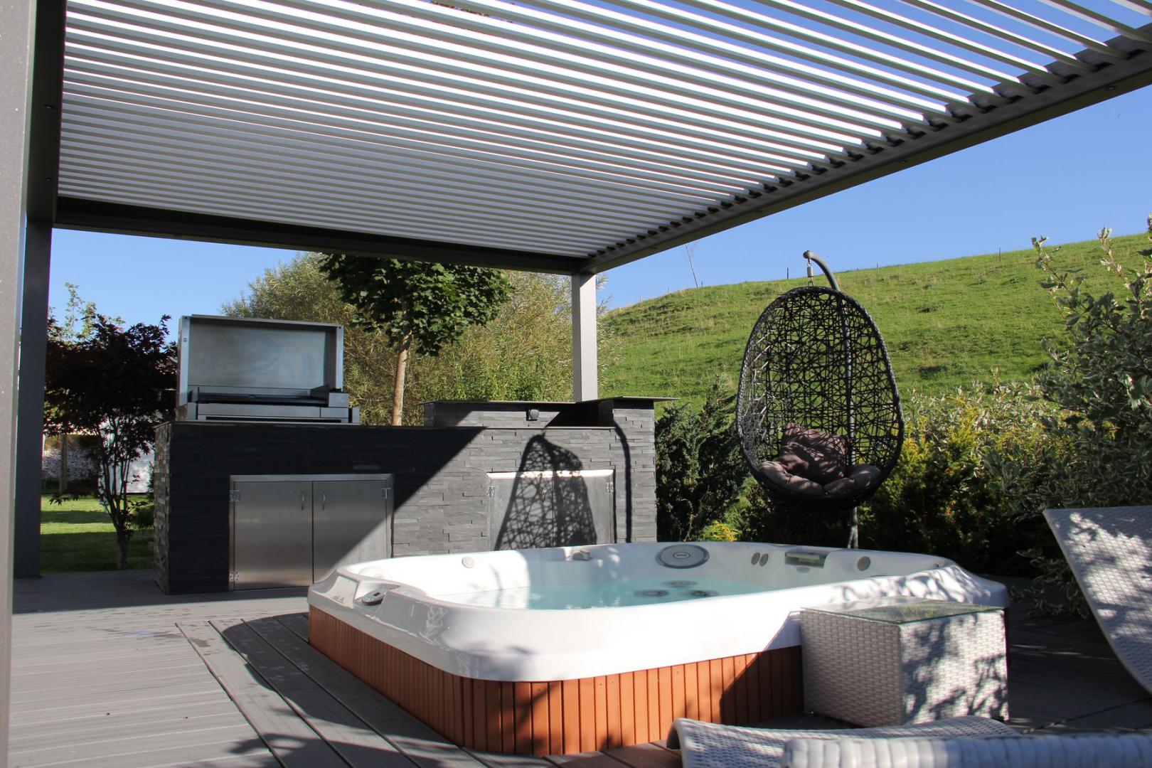 Pergola bio-climatique Biossun avec spa, bar et barbecue
